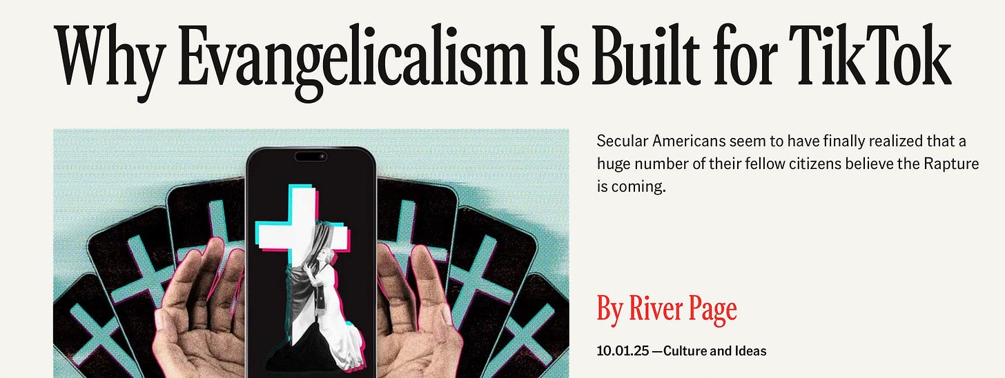 Speaking of criss-crossing the planet, my conversation with Washington Post columnist Shadi Hamid is now up (follow us over on YT!), and this week is busy with three more live conversations: tonight on Monday 11/17 at 8pm PST The Free Press Senior Editor Peter Savodnik joins me to talk about his personal and professional evolution as an international reporter. Then On Wednesday 11/19 at 9am EST his Gen Z colleague River Page joins me to talk all things TikTok, Evangelicals, voting blue in a red state, and more. And Thursday 11/20 at 9am EST, Deepest Beliefs Lab director and OSU endowed chair in social psychology Kurt Gray, author of Outraged, joins me to discuss misinformation, social psychology, and tension and repair in America. I hope you can join us; I have free gift links for Wednesday and Thursday if you want to grab those.